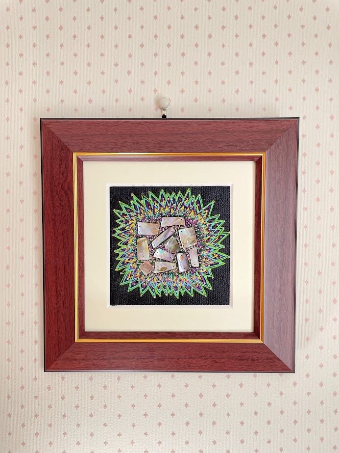 見る角度によって変化するメキシコ鮑貝の玉虫色の世界を、刺繡糸とビーズを併せて、抽象表現してみました。